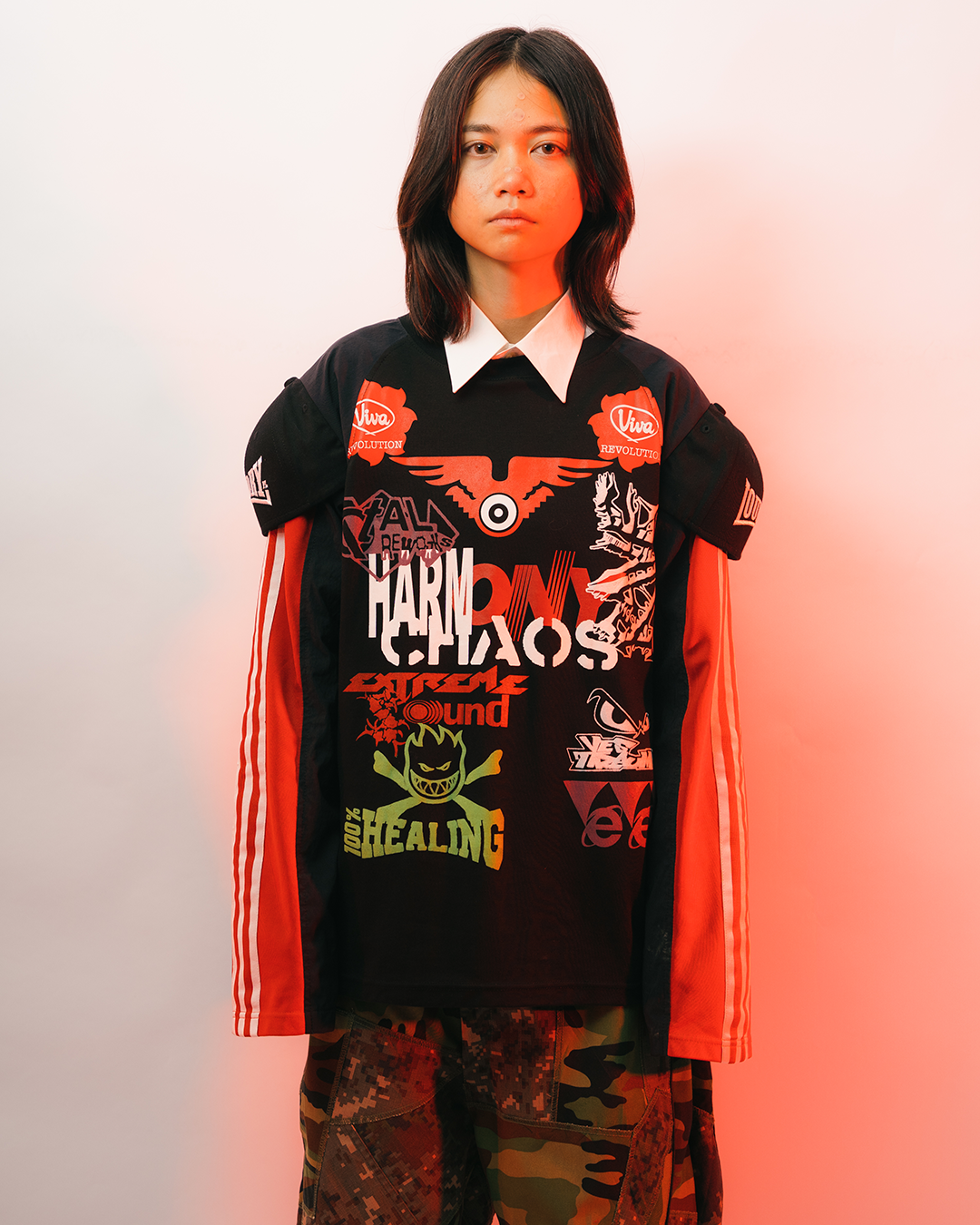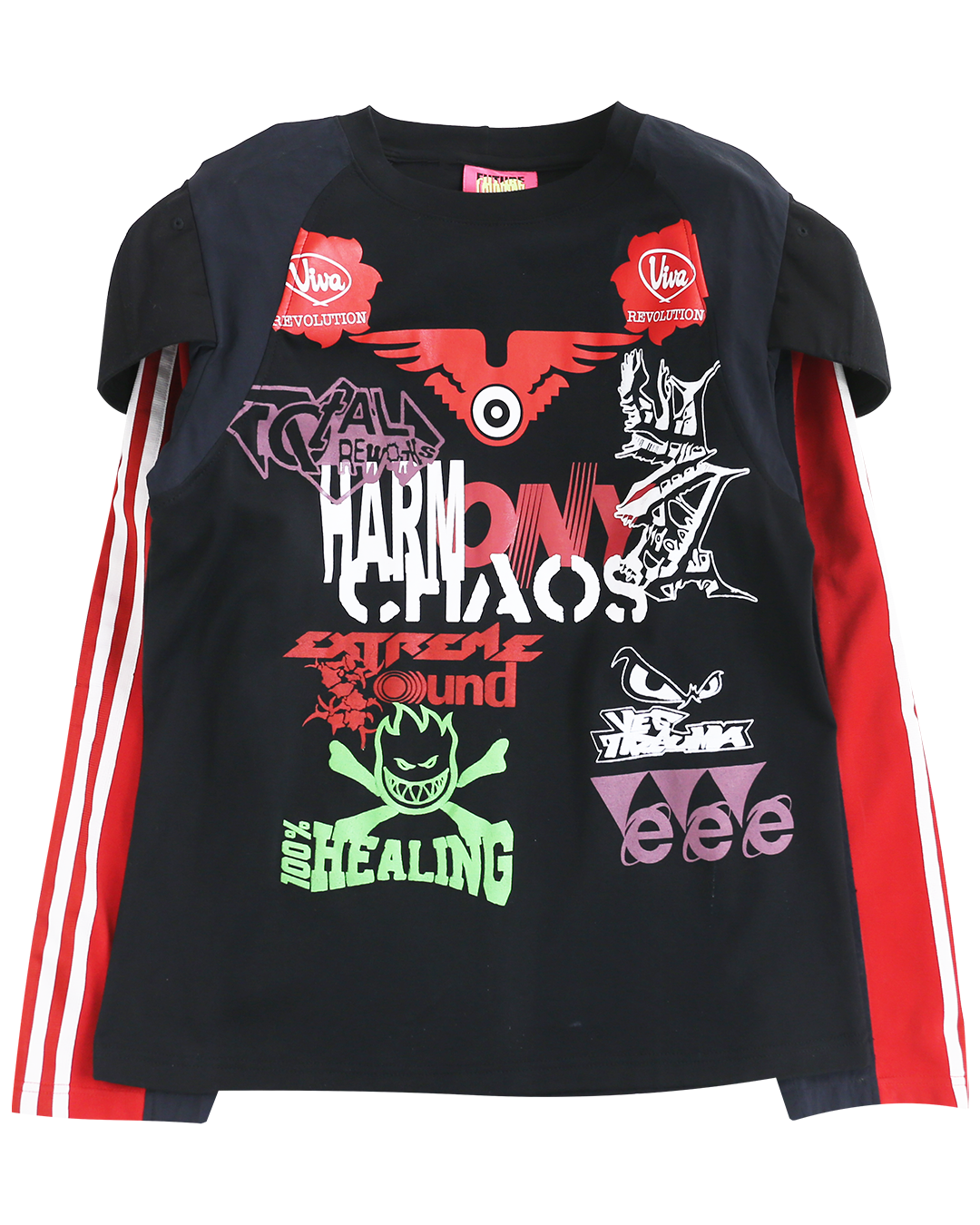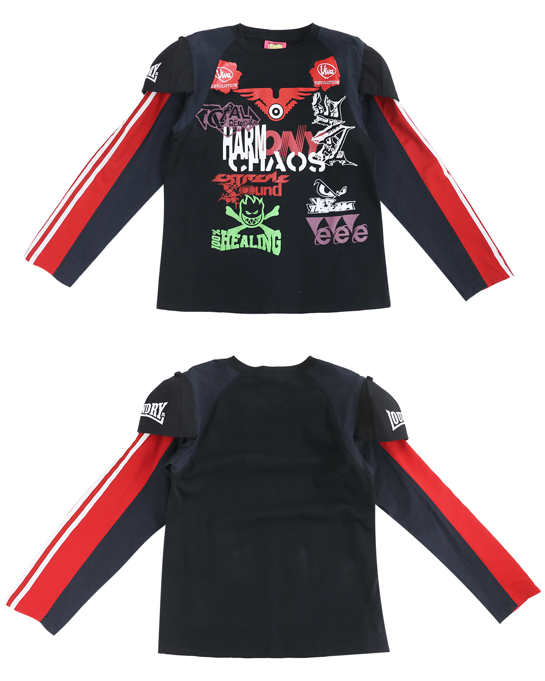 ・Long-sleeve top featuring various items docked together