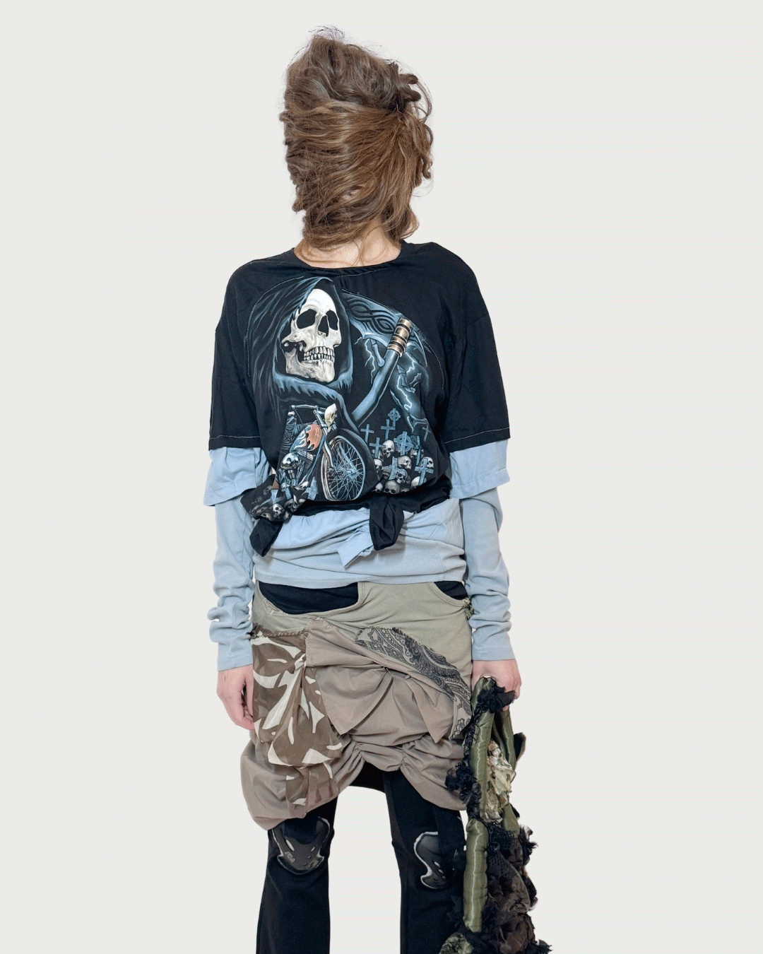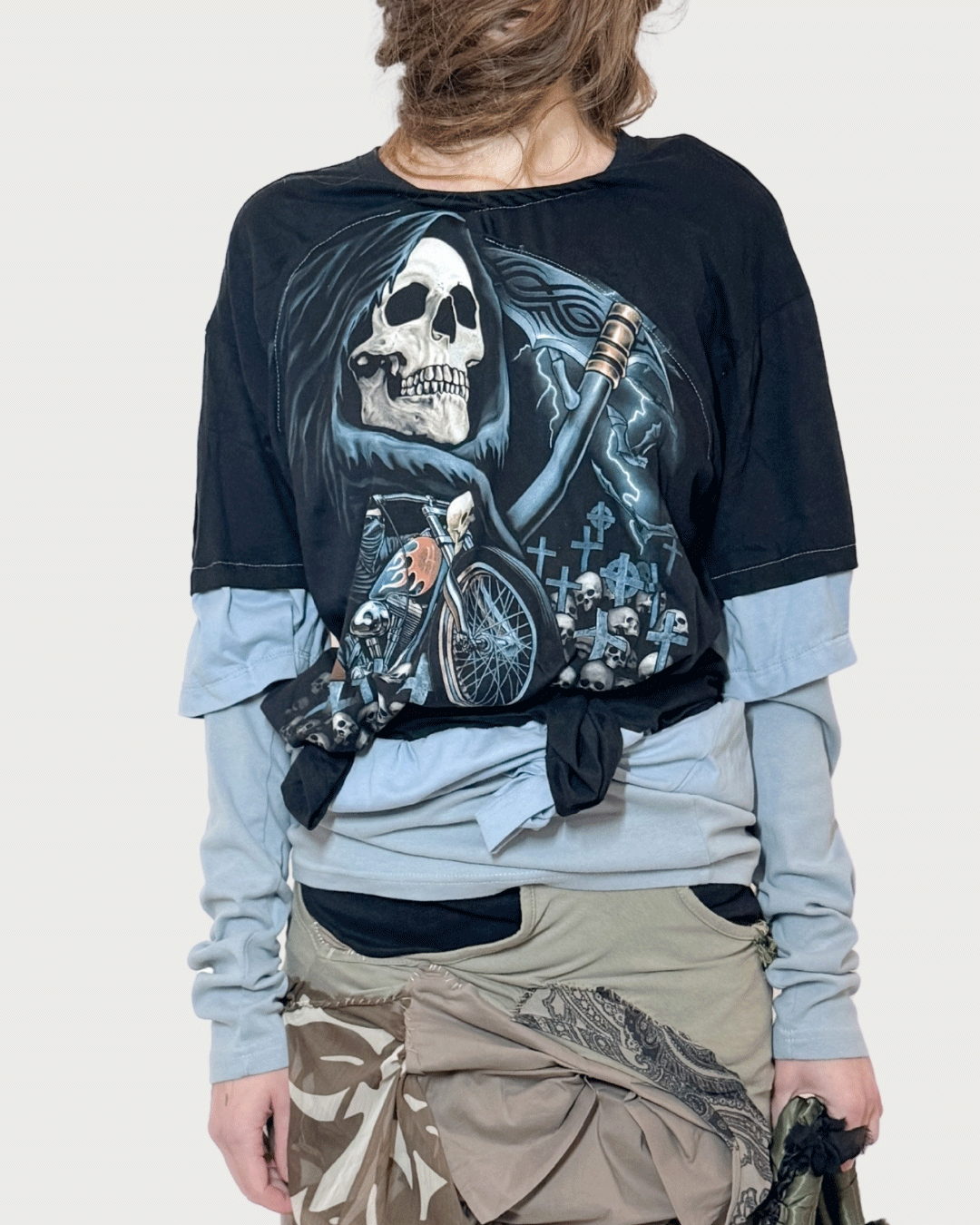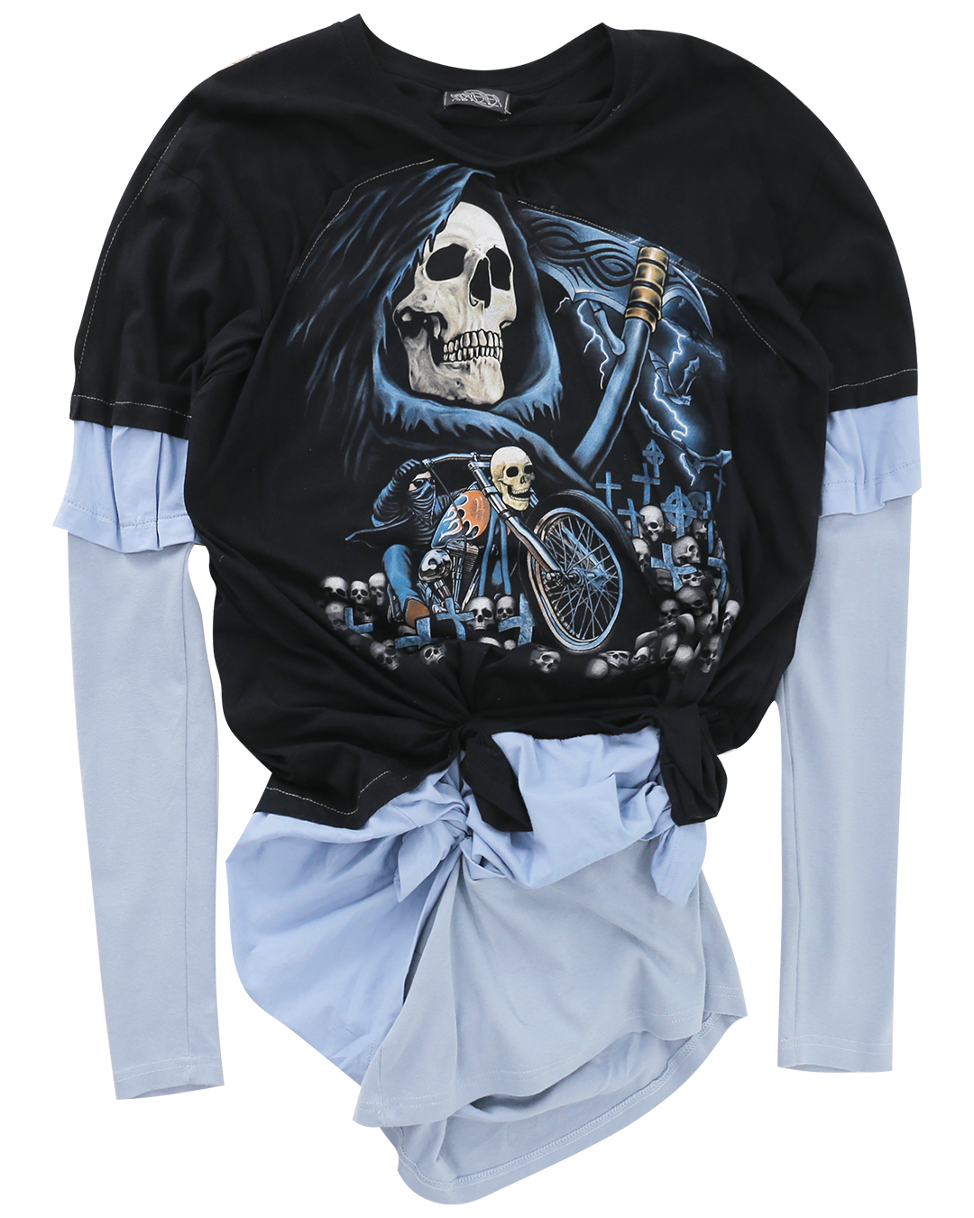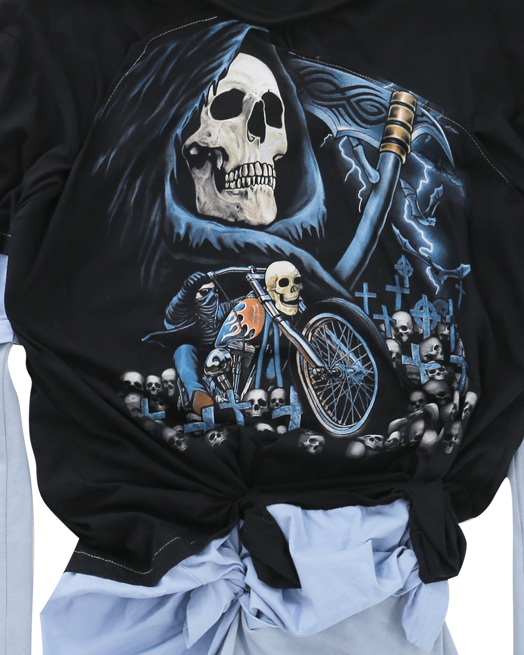 ・Features a large blue Grim Reaper printed on the front